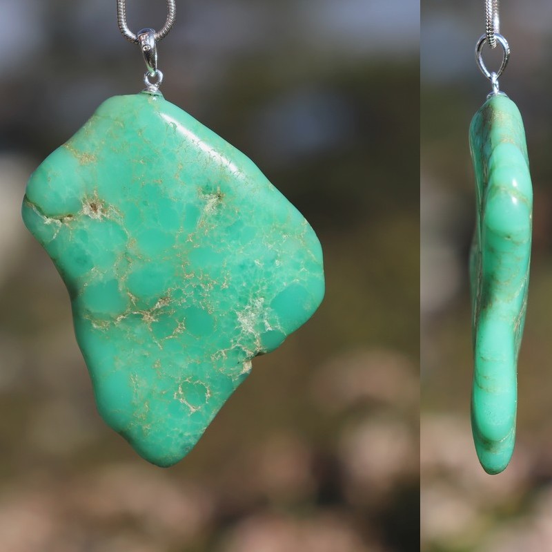 Dieser wunderschöne XXL Nugget-Anhänger aus reinem Chrysopras ist ca. 44x56mm gross und hat eine 925 Silberöse.