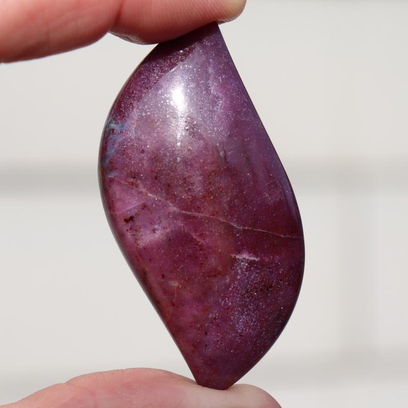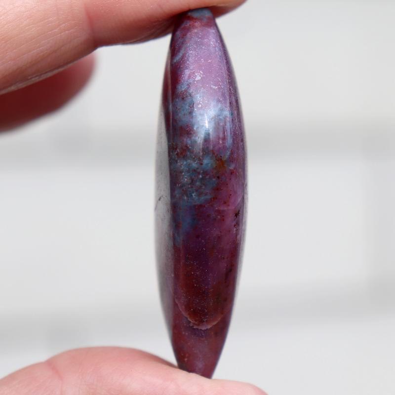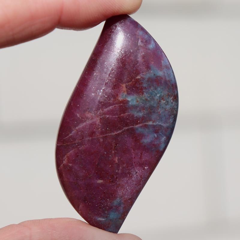 Dieser seltene Rubin-Handschmeichler mit Disthen (Kyanit) ist 15x33x65mm gross und 61g schwer.